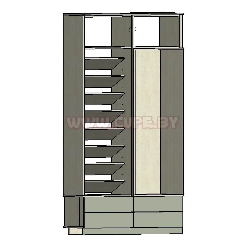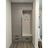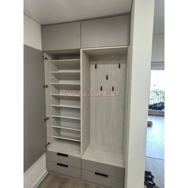 Конструкция включает шкаф с распашной дверью, выдвижные ящики и нишу с крючками для одежды.